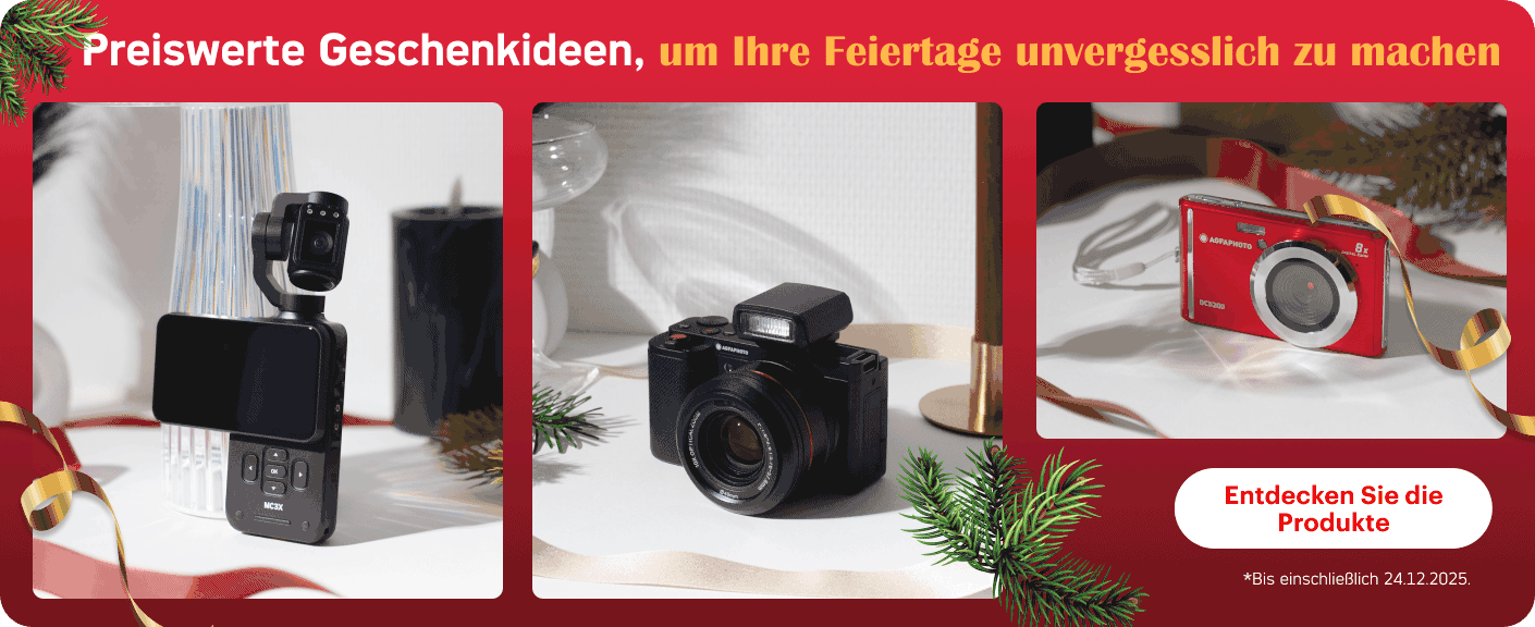 Entfesseln Sie Ihre Kreativität mit der AgfaPhoto Vlogging-Reihe! Entdecken Sie unsere kompletten Kamera + Mikrofon-Kits für einwandfreien Ton, unsere 4K-Gimbal-Kamera für ultrastabile Aufnahmen und alle wichtigen Zubehörteile zum Filmen und Bearbeiten Ihrer Inhalte.